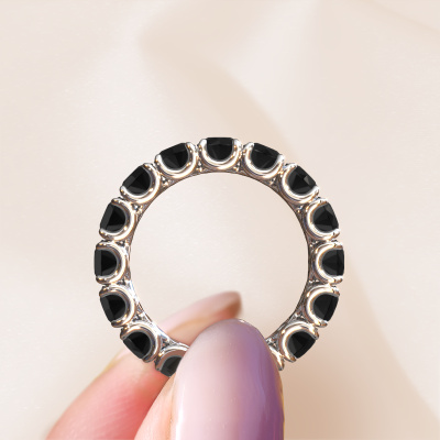 This Estee 4.2 ring in 14 Carat white gold is set with black diamond. This white gold stacked Estee 4.2 ring is the perfect addition to your ring collection! As the name suggests, it is a ring which can be combined on one finger with another ring. It gives you the opportunity to create your own style. A stacked ring usually represents a certain memory of someone special or a memorable moment. It is common to combine a stacked ring, representing an anniversary, with a wedding ring. But this eternity ring, combined with your other rings, also makes a classy fashion item. The eternity Estee 4.2 ring, as shown here, can be customized to your liking. Our online tool offers many different options but please feel free to contact us if you want changes made to your Estee 4.2 ring, which are unavailable in our online tool.After receiving your order, our goldsmiths will passionately start the creative process of making your ring in our own studio. Because we don't have a big stockpile, these costs will not be passed on to you. Our pricing is proof of that! We offer top quality jewels at lowest price, guaranteed.To make it easier for you, we offer a 30 day return policy. Check our terms and conditions.
