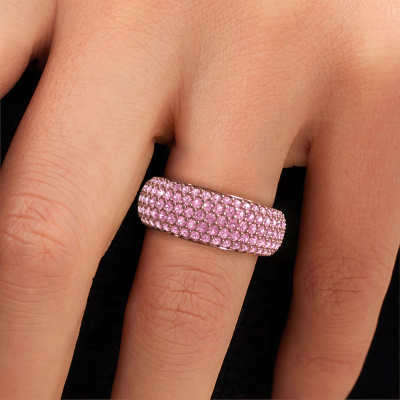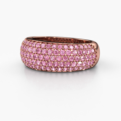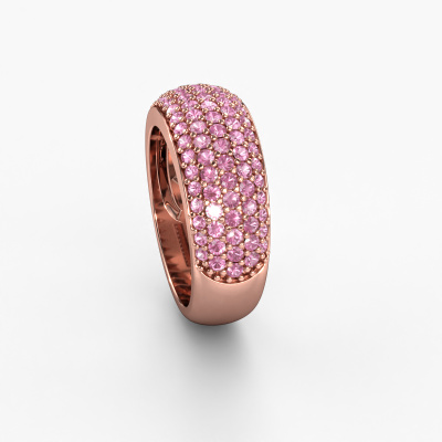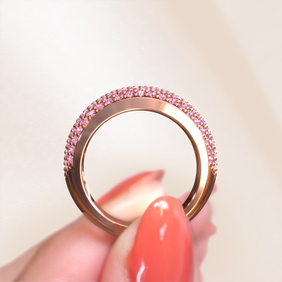 This pave set ring is called Cristy. This 14 Carat rose gold ring is set with pink sapphire 1.2 mm. The band of this rose gold ring is set with rows of pink sapphire which seem to have no beginning nor end. Our goldsmith carefully selects the gemstones and sets them with the utmost precision. For maximum shine, the pink sapphire have to align perfectly. While artfully crafting and polishing the jewellery, light fall is constantly monitored, until the expert goldsmith is satisfied with the result. Designed by you, created especially for you!As soon as you finished designing your Cristy ring with our online tool, our goldsmiths will start their creative process of making your ring. This will be done with passion and care, according ancient crafting. On top of that, our jewels are made of eco-friendly materials. Simply customize online with our online tool, if you want any changes made. If you want specific changes made to your Cristy ring, that are unavailable in our online tool, please feel free to contact our expert designers.Because we design and deliver our own rings, we can offer you a ring at a price you won't find anywhere else. A ring is made to order, which helps prevent excess supplies, so we can make you a great price offer. We understand it feels risky, buying your ring online, but we will gladly assist in the designing process, taking your budget into consideration.To make it easier for you, we offer a 30 day return policy. Check our terms and conditions.