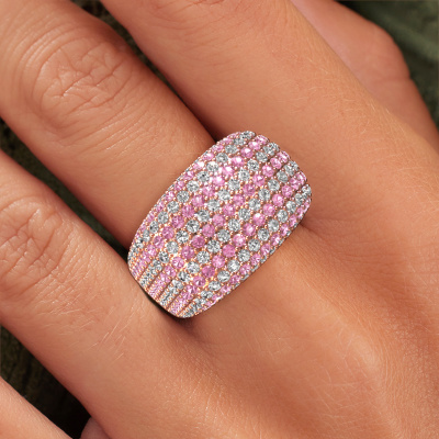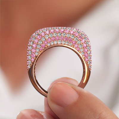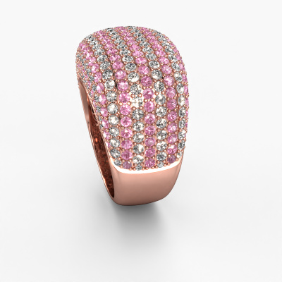 This is a stunning pavé set rose gold Kira ring. It is set with pink sapphire. A designer ring, fit for classy women. The ring is designed by our own expert goldsmiths. In our artisan studio, we use a combination of the latest techniques and ancient traditional craftsmanship, so we are able to create a perfectly designed ring. Our expert goldsmiths strive for perfection so they won't stop until a perfect ring, a true work of art, is created. A unique ring which matches your own style. A customized exclusive ring is the perfect gift! New exquisite designs are added daily by our team of passionate goldsmiths. And each design can be customized. Simply customize the precious metals and the colour of gemstones which will be used, for example. This makes your design of the exclusive kira ring truly unique!By using a combination of the latest modern techniques, combined with ancient crafting, we can make all our rings in our own studio. Each jewel is made to order. This is advantageous because we can offer you a price you won't find anywhere else.To make it easier for you, we offer a 30 day return policy. Check our terms and conditions.
