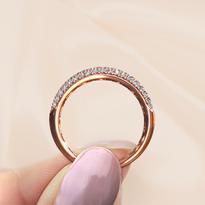 This Emely 2 ring in 14 Carat rose gold is set with zirconia. This rose gold stacked Emely 2 ring is the perfect addition to your ring collection! As the name suggests, it is a ring which can be combined on one finger with another ring. It gives you the opportunity to create your own style. A stacked ring usually represents a certain memory of someone special or a memorable moment. It is common to combine a stacked ring, representing an anniversary, with a wedding ring. But this pavé set ring, combined with your other rings, also makes a classy fashion item. How do you like this modern rose gold ring? Simply customize this Emely 2 ring, using our online tool. Subsequently, your personal pavé set Emely 2 ring will be made by hand by our goldsmiths. Precious metals and gemstones can be customized to your liking. Do you have specific preferences which are unavailable in our online tool? Please feel free to contact us. We will customize your personal modern ring to your liking.After receiving your order, our goldsmiths will passionately start the creative process of making your ring in our own studio. Because we don't have a big stockpile, these costs will not be passed on to you. Our pricing is proof of that! We offer top quality jewels at lowest price, guaranteed.To make it easier for you, we offer a 30 day return policy. Check our terms and conditions.