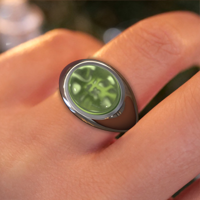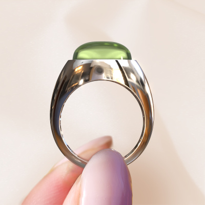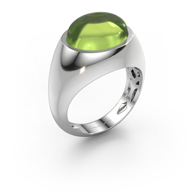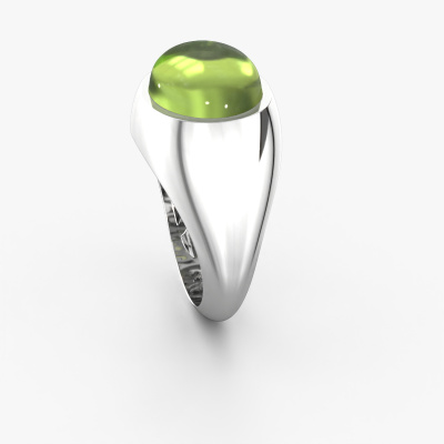 In this photo the white gold Laurien ring is set with a cabochon peridot. Cabochon means a peridot is shaped first, not faceted, into a specific shape, such as a drop, heart or oval cabochon. Subsequently, it is polished until the gemstone has a orb shaped surface. A cabochon gemstone is a stunning, classy eye-catcher that matches perfectly with a contemporary as well as a vintage style. Our expert goldsmiths shape the fashionable ring to perfection which makes it unique. The cabochon peridot is set so its unique qualities are strengthened. The best part of this fashionable ring is that you can customize it to your own liking. Your style, your choice, your ring. On top of that, your modern white gold ring will be made by hand with eco-friendly materials! Please feel free to easily customize the ring, using our online tool.After receiving your order, our goldsmiths will passionately start the creative process of making your ring in our own studio. Because we don't have a big stockpile, these costs will not be passed on to you. Our pricing is proof of that! We offer top quality jewels at lowest price, guaranteed.To make it easier for you, we offer a 30 day return policy. Check our terms and conditions.