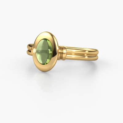 In this photo the gold Brittni ring is set with a cabochon peridot. Cabochon means a peridot is shaped first, not faceted, into a specific shape, such as a drop, heart or oval cabochon. Subsequently, it is polished until the gemstone has a orb shaped surface. A cabochon gemstone is a stunning, classy eye-catcher that matches perfectly with a contemporary as well as a vintage style. Our expert goldsmiths shape the tasteful ring to perfection which makes it unique. The cabochon peridot is set so its unique qualities are strengthened. Our goldsmiths passionately create your customized ring to your liking with the utmost care. The gold ring, as shown here, can be customized using our online tool. Feel free to ask our jewel designers for assistance if you want changes made which are unavailable in our online tool. We are happy to answer your questions.Because we design and deliver our own rings, we can offer you a ring at a price you won't find anywhere else. A ring is made to order, which helps prevent excess supplies, so we can make you a great price offer. We understand it feels risky, buying your ring online, but we will gladly assist in the designing process, taking your budget into consideration.To make it easier for you, we offer a 30 day return policy. Check our terms and conditions.