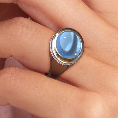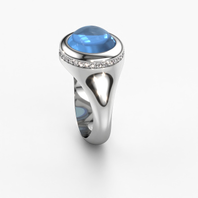 In this photo the platinum Lesli OVL ring is set with a cabochon blue topaz. Cabochon means a blue topaz is shaped first, not faceted, into a specific shape, such as a drop, heart or oval cabochon. Subsequently, it is polished until the gemstone has a orb shaped surface. A cabochon gemstone is a stunning, classy eye-catcher that matches perfectly with a contemporary as well as a vintage style. Our expert goldsmiths shape the fashionable ring to perfection which makes it unique. The cabochon blue topaz is set so its unique qualities are strengthened. How do you like this modern platinum ring? Simply customize this Lesli OVL ring, using our online tool. Subsequently, your personal fashionable Lesli OVL ring will be made by hand by our goldsmiths. Precious metals and gemstones can be customized to your liking. Do you have specific preferences which are unavailable in our online tool? Please feel free to contact us. We will customize your personal modern ring to your liking.By using a combination of the latest modern techniques, combined with ancient crafting, we can make all our rings in our own studio. Each jewel is made to order. This is advantageous because we can offer you a price you won't find anywhere else.To make it easier for you, we offer a 30 day return policy. Check our terms and conditions.