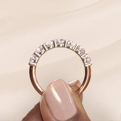 This ring is called Heddy Half. It is made of 14 Carat rose gold and is set with 3.7 mm morganite champagne. Are you looking for a unique rose gold ring with a modern appearance? Then this is the ring for you. Simply customize to your or her liking.