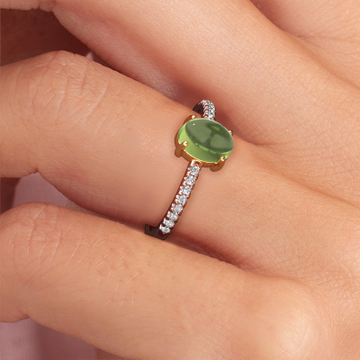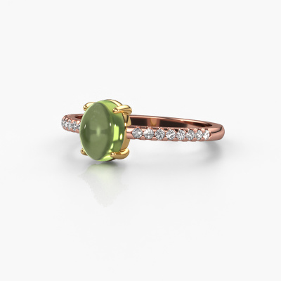In this photo the rose gold Becky ring is set with a cabochon peridot. Cabochon means a peridot is shaped first, not faceted, into a specific shape, such as a drop, heart or oval cabochon. Subsequently, it is polished until the gemstone has a orb shaped surface. A cabochon gemstone is a stunning, classy eye-catcher that matches perfectly with a contemporary as well as a vintage style. Our expert goldsmiths shape the birthstones ring to perfection which makes it unique. The cabochon peridot is set so its unique qualities are strengthened. How do you like this fantasy rose gold ring? Simply customize this Becky ring, using our online tool. Subsequently, your personal birthstones Becky ring will be made by hand by our goldsmiths. Precious metals and gemstones can be customized to your liking. Do you have specific preferences which are unavailable in our online tool? Please feel free to contact us. We will customize your personal fantasy ring to your liking.By using a combination of the latest modern techniques, combined with ancient crafting, we can make all our rings in our own studio. Each jewel is made to order. This is advantageous because we can offer you a price you won't find anywhere else.To make it easier for you, we offer a 30 day return policy. Check our terms and conditions.