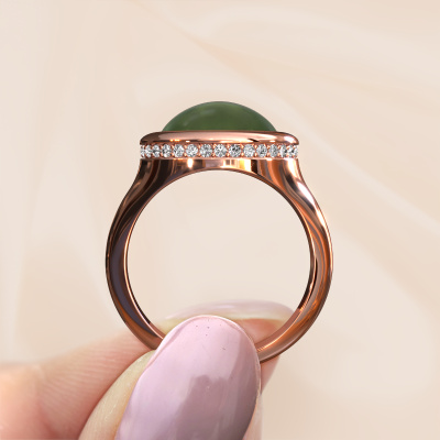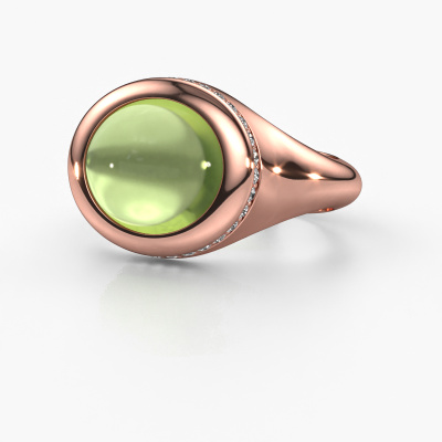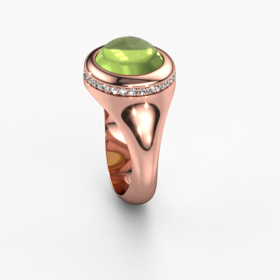In this photo the rose gold Lesli OVL ring is set with a cabochon peridot. Cabochon means a peridot is shaped first, not faceted, into a specific shape, such as a drop, heart or oval cabochon. Subsequently, it is polished until the gemstone has a orb shaped surface. A cabochon gemstone is a stunning, classy eye-catcher that matches perfectly with a contemporary as well as a vintage style. Our expert goldsmiths shape the fashionable ring to perfection which makes it unique. The cabochon peridot is set so its unique qualities are strengthened. How do you like this modern rose gold ring? Simply customize this Lesli OVL ring, using our online tool. Subsequently, your personal fashionable Lesli OVL ring will be made by hand by our goldsmiths. Precious metals and gemstones can be customized to your liking. Do you have specific preferences which are unavailable in our online tool? Please feel free to contact us. We will customize your personal modern ring to your liking.By using a combination of the latest modern techniques, combined with ancient crafting, we can make all our rings in our own studio. Each jewel is made to order. This is advantageous because we can offer you a price you won't find anywhere else.To make it easier for you, we offer a 30 day return policy. Check our terms and conditions.