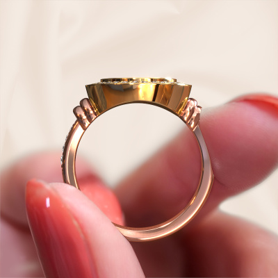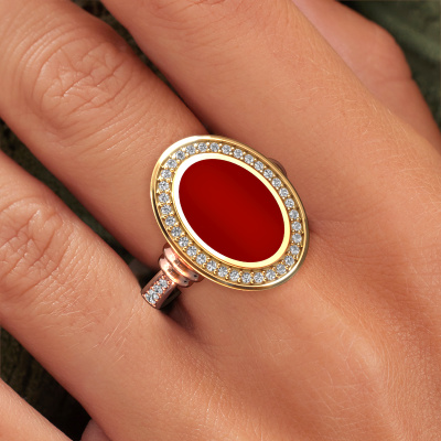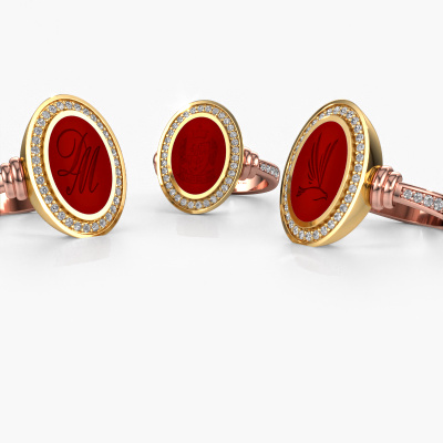 This rose gold women´s signet ring is a true work of art! This is our special Cristina signet ring and it is set with a oval shape carnelian. In our crafting studio, we use a combination of the latest techniques and ancient traditional craftsmanship, so we are able to create a detailed perfect signet ring. Our expert goldsmiths are fascinated by signet rings. The signet ring can be engraved with initials or a family weapon. Signet rings with family weapons can be handed down from generation to generation and that usually is the case. On top of that, a signet ring is a beautiful, classy piece of jewellery which is trending once more. More than one reason to start or extend the tradition. Please browse our online database for more options on engravings. You can find the departments of our education centre at the bottom of this page. As soon as you finished designing your Cristina signet ring with our online tool, our goldsmiths will start their creative process of making your ring. This will be done with passion and care, according ancient crafting. On top of that, our jewels are made of eco-friendly materials. Simply customize online with our online tool, if you want any changes made. If you want specific changes made to your Cristina signet ring, that are unavailable in our online tool, please feel free to contact our expert designers.After receiving your order, our goldsmiths will passionately start the creative process of making your ring in our own studio. Because we don't have a big stockpile, these costs will not be passed on to you. Our pricing is proof of that! We offer top quality jewels at lowest price, guaranteed.To make it easier for you, we offer a 30 day return policy. Check our terms and conditions.