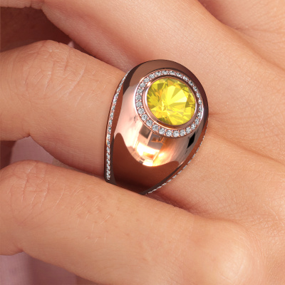 This is a stunning birthstones rose gold Roxann ring. It is set with yellow sapphire. A designer ring, fit for classy women. The ring is designed by our own expert goldsmiths. In our artisan studio, we use a combination of the latest techniques and