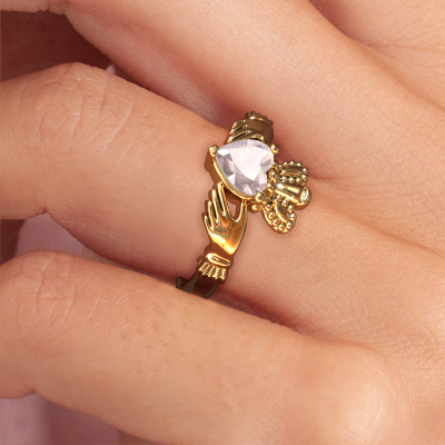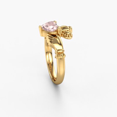 This Irish Claddagh ring is a sign of love set with a heart morganite champagne. It is a remarkable, symbolic ring in which a crowned heart, held by two hands, is shown. The heart of a Claddagh ring is a symbol of love, the hands represent friendship and the crown, loyalty. A beautiful piece of jewellery to either give or receive! This symbolic 14 Carat gold Claddagh 2 ring is made by hand in our own studio by our expert goldsmiths. The symbolic Claddagh 2 ring, as shown here, can be customized to your liking. Our online tool offers many different options but please feel free to contact us if you want changes made to your Claddagh 2 ring, which are unavailable in our online tool.After receiving your order, our goldsmiths will start the creative process of making your Claddagh 2 ring. We don't keep stock. This is advantageous because these costs will not be passed on to you. Therefore, we can offer jewellery at exceptionally low prices.To make it easier for you, we offer a 30 day return policy. Check our terms and conditions.