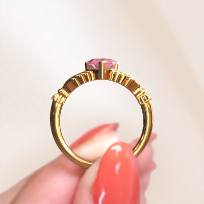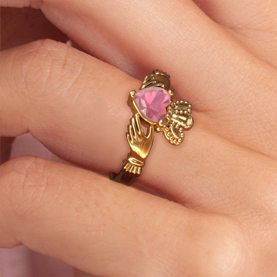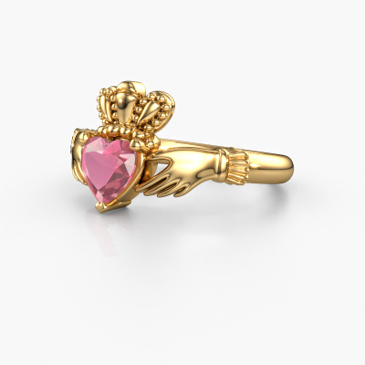 This Irish Claddagh ring is a sign of love set with a heart tourmaline pink. It is a remarkable, symbolic ring in which a crowned heart, held by two hands, is shown. The heart of a Claddagh ring is a symbol of love, the hands represent friendship and the crown, loyalty. A beautiful piece of jewellery to either give or receive! This symbolic 14 Carat gold Claddagh 2 ring is made by hand in our own studio by our expert goldsmiths. The symbolic Claddagh 2 ring, as shown here, can be customized to your liking. Our online tool offers many different options but please feel free to contact us if you want changes made to your Claddagh 2 ring, which are unavailable in our online tool.After receiving your order, our goldsmiths will start the creative process of making your Claddagh 2 ring. We don't keep stock. This is advantageous because these costs will not be passed on to you. Therefore, we can offer jewellery at exceptionally low prices.To make it easier for you, we offer a 30 day return policy. Check our terms and conditions.