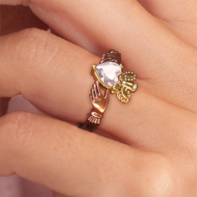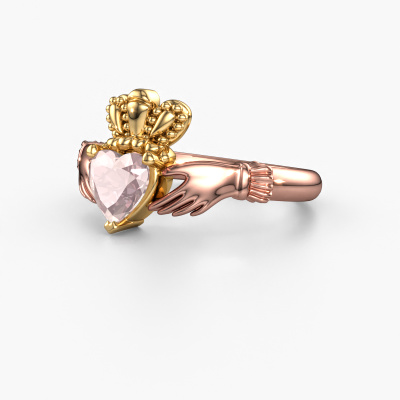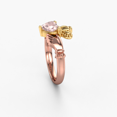 This Irish Claddagh ring is a sign of love set with a heart morganite champagne. It is a remarkable, symbolic ring in which a crowned heart, held by two hands, is shown. The heart of a Claddagh ring is a symbol of love, the hands represent friendship and the crown, loyalty. A beautiful piece of jewellery to either give or receive! This symbolic 14 Carat rose gold Claddagh 2 ring is made by hand in our own studio by our expert goldsmiths. The symbolic Claddagh 2 ring, as shown here, can be customized to your liking. Our online tool offers many different options but please feel free to contact us if you want changes made to your Claddagh 2 ring, which are unavailable in our online tool.After receiving your order, our goldsmiths will start the creative process of making your Claddagh 2 ring. We don't keep stock. This is advantageous because these costs will not be passed on to you. Therefore, we can offer jewellery at exceptionally low prices.To make it easier for you, we offer a 30 day return policy. Check our terms and conditions.