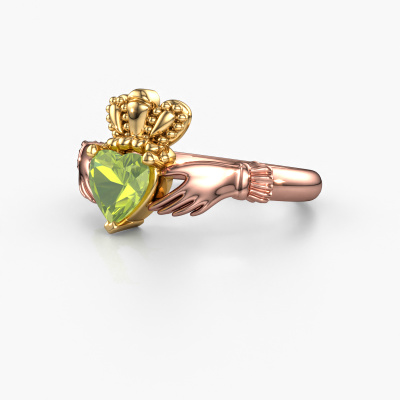 This Irish Claddagh ring is a sign of love set with a heart peridot. It is a remarkable, symbolic ring in which a crowned heart, held by two hands, is shown. The heart of a Claddagh ring is a symbol of love, the hands represent friendship and the crown, loyalty. A beautiful piece of jewellery to either give or receive! This symbolic 14 Carat rose gold Claddagh 2 ring is made by hand in our own studio by our expert goldsmiths. The symbolic Claddagh 2 ring, as shown here, can be customized to your liking. Our online tool offers many different options but please feel free to contact us if you want changes made to your Claddagh 2 ring, which are unavailable in our online tool.After receiving your order, our goldsmiths will start the creative process of making your Claddagh 2 ring. We don't keep stock. This is advantageous because these costs will not be passed on to you. Therefore, we can offer jewellery at exceptionally low prices.To make it easier for you, we offer a 30 day return policy. Check our terms and conditions.