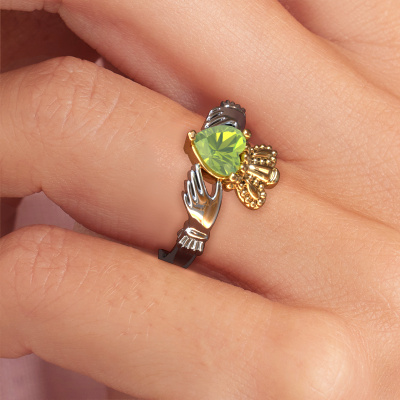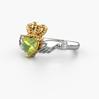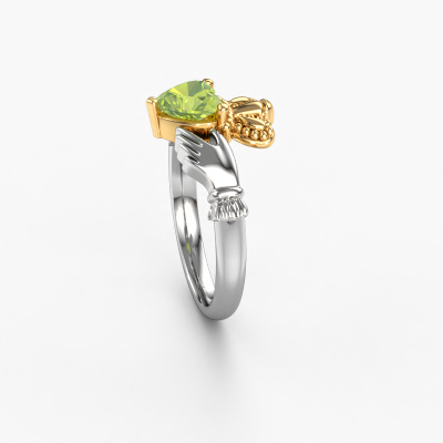 This Irish Claddagh ring is a sign of love set with a heart peridot. It is a remarkable, symbolic ring in which a crowned heart, held by two hands, is shown. The heart of a Claddagh ring is a symbol of love, the hands represent friendship and the crown, loyalty. A beautiful piece of jewellery to either give or receive! This symbolic 14 Carat white gold Claddagh 2 ring is made by hand in our own studio by our expert goldsmiths. The symbolic Claddagh 2 ring, as shown here, can be customized to your liking. Our online tool offers many different options but please feel free to contact us if you want changes made to your Claddagh 2 ring, which are unavailable in our online tool.After receiving your order, our goldsmiths will start the creative process of making your Claddagh 2 ring. We don't keep stock. This is advantageous because these costs will not be passed on to you. Therefore, we can offer jewellery at exceptionally low prices.To make it easier for you, we offer a 30 day return policy. Check our terms and conditions.