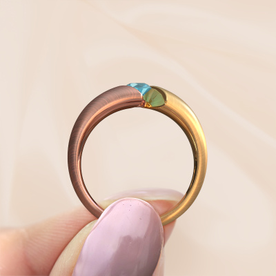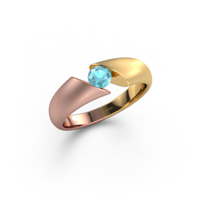 This ring called Hojalien 1 is made of 14 Carat rose gold and is set with blue topaz. Are you in the market for a unique rose gold ring with a modern twist? Then this ring might suit you. Simply customize to your or her liking. It suits the contemporary modern woman. This tasteful ring is set with beautiful blue topaz. This has been carefully selected. Because your ring must be adorned with nothing but the most stunning gemstone. Our expert goldsmith will create your ring in our own studio, where the blue topaz will be set with great care. The ring will then be polished to perfection to create a stunning ring. By using our modern techniques, we can design and customize the finest quality jewels with the utmost care for you. Our rings are always priced 30 percent lower than other jewellers. We make rings to order, so we don't have to maintain a large stock. If you have a certain budget, we are more than happy to advice you accordingly.