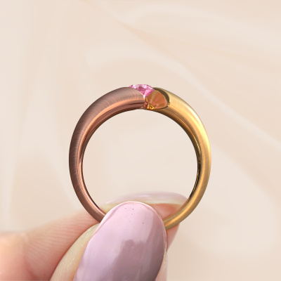 This ring called Hojalien 1 is made of 14 Carat rose gold and is set with pink sapphire. Are you in the market for a unique rose gold ring with a modern twist? Then this ring might suit you. Simply customize to your or her liking. It suits the contemporary modern woman. This tasteful ring is set with beautiful pink sapphire. This has been carefully selected. Because your ring must be adorned with nothing but the most stunning gemstone. Our expert goldsmith will create your ring in our own studio, where the pink sapphire will be set with great care. The ring will then be polished to perfection to create a stunning ring. By using our modern techniques, we can design and customize the finest quality jewels with the utmost care for you. Our rings are always priced 30 percent lower than other jewellers. We make rings to order, so we don't have to maintain a large stock. If you have a certain budget, we are more than happy to advice you accordingly.