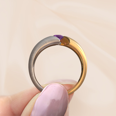 This ring called Hojalien 1 is made of 14 Carat white gold and is set with amethyst. Are you in the market for a unique white gold ring with a modern twist? Then this ring might suit you. Simply customize to your or her liking. It suits the contemporary modern woman. This tasteful ring is set with beautiful amethyst. This has been carefully selected. Because your ring must be adorned with nothing but the most stunning gemstone. Our expert goldsmith will create your ring in our own studio, where the amethyst will be set with great care. The ring will then be polished to perfection to create a stunning ring. By using our modern techniques, we can design and customize the finest quality jewels with the utmost care for you. Our rings are always priced 30 percent lower than other jewellers. We make rings to order, so we don't have to maintain a large stock. If you have a certain budget, we are more than happy to advice you accordingly.