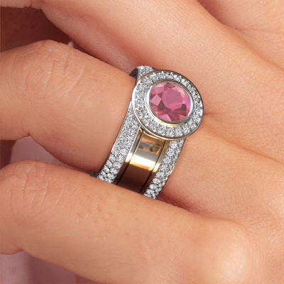 Because of its detailed finish, this wide ring with tourmaline pink has a stylish appearance. A pavé set ring that fits the contemporary woman like a glove. This platinum ring, our Roxie, is a true eye-catcher indeed! As soon as we know what you