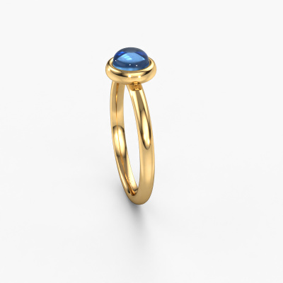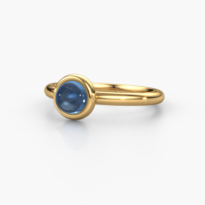 In this photo the gold Blossom ring is set with a cabochon blue topaz. Cabochon means a blue topaz is shaped first, not faceted, into a specific shape, such as a drop, heart or round cabochon. Subsequently, it is polished until the gemstone has a orb shaped surface. A cabochon gemstone is a stunning, classy eye-catcher that matches perfectly with a contemporary as well as a vintage style. Our expert goldsmiths shape the charming ring to perfection which makes it unique. The cabochon blue topaz is set so its unique qualities are strengthened. The charming Blossom ring, as shown here, can be customized to your liking. Our online tool offers many different options but please feel free to contact us if you want changes made to your Blossom ring, which are unavailable in our online tool.Because we design and deliver our own rings, we can offer you a ring at a price you won't find anywhere else. A ring is made to order, which helps prevent excess supplies, so we can make you a great price offer. We understand it feels risky, buying your ring online, but we will gladly assist in the designing process, taking your budget into consideration.To make it easier for you, we offer a 30 day return policy. Check our terms and conditions.