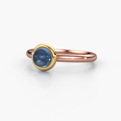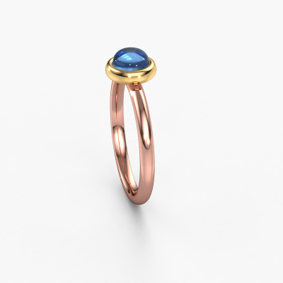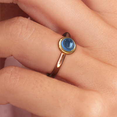 In this photo the rose gold Blossom ring is set with a cabochon blue topaz. Cabochon means a blue topaz is shaped first, not faceted, into a specific shape, such as a drop, heart or round cabochon. Subsequently, it is polished until the gemstone has a orb shaped surface. A cabochon gemstone is a stunning, classy eye-catcher that matches perfectly with a contemporary as well as a vintage style. Our expert goldsmiths shape the charming ring to perfection which makes it unique. The cabochon blue topaz is set so its unique qualities are strengthened. The charming Blossom ring, as shown here, can be customized to your liking. Our online tool offers many different options but please feel free to contact us if you want changes made to your Blossom ring, which are unavailable in our online tool.Because we design and deliver our own rings, we can offer you a ring at a price you won't find anywhere else. A ring is made to order, which helps prevent excess supplies, so we can make you a great price offer. We understand it feels risky, buying your ring online, but we will gladly assist in the designing process, taking your budget into consideration.To make it easier for you, we offer a 30 day return policy. Check our terms and conditions.