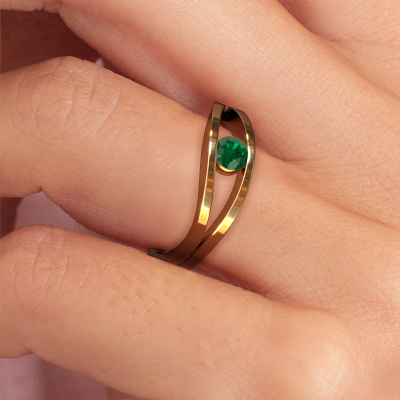 This ring called Sigrid 1 is made of 14 Carat gold and is set with emerald. Are you in the market for a unique gold ring with a modern twist? Then this ring might suit you. Simply customize to your or her liking. It suits the contemporary modern woman. This twist ring is set with beautiful emerald. This has been carefully selected. Because your ring must be adorned with nothing but the most stunning gemstone. Our expert goldsmith will create your ring in our own studio, where the emerald will be set with great care. The ring will then be polished to perfection to create a stunning ring. By using our modern techniques, we can design and customize the finest quality jewels with the utmost care for you. Our rings are always priced 30 percent lower than other jewellers. We make rings to order, so we don't have to maintain a large stock. If you have a certain budget, we are more than happy to advice you accordingly.Our team of talented, passionate designers add new ring designs to our online collection daily. Our objective in doing so, is to be able to offer you a wide variety of jewels. Please feel free to request a quote if you have specific wishes for your ring. We guarantee to make you an offer you can't refuse.To make it easier for you, we offer a 30 day return policy. Check our terms and conditions.