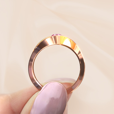 This ring called Sigrid 1 is made of 14 Carat rose gold and is set with pink sapphire. Are you in the market for a unique rose gold ring with a modern twist? Then this ring might suit you. Simply customize to your or her liking. It suits the contemporary modern woman. This twist ring is set with beautiful pink sapphire. This has been carefully selected. Because your ring must be adorned with nothing but the most stunning gemstone. Our expert goldsmith will create your ring in our own studio, where the pink sapphire will be set with great care. The ring will then be polished to perfection to create a stunning ring. By using our modern techniques, we can design and customize the finest quality jewels with the utmost care for you. Our rings are always priced 30 percent lower than other jewellers. We make rings to order, so we don't have to maintain a large stock. If you have a certain budget, we are more than happy to advice you accordingly.Our team of talented, passionate designers add new ring designs to our online collection daily. Our objective in doing so, is to be able to offer you a wide variety of jewels. Please feel free to request a quote if you have specific wishes for your ring. We guarantee to make you an offer you can't refuse.To make it easier for you, we offer a 30 day return policy. Check our terms and conditions.