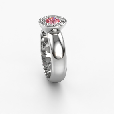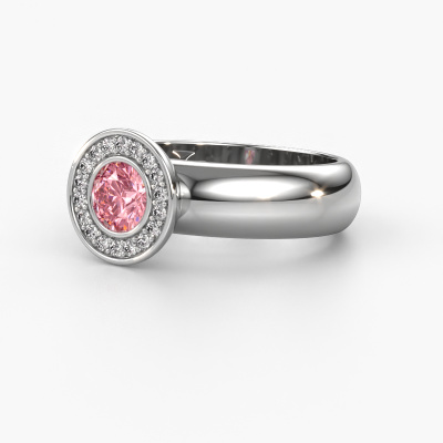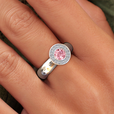 The ring shown above is called Anna. This type of ring is known as a solitaire ring. The 14 Carat white gold ring is set with a 5 mm round pink lab grown diamond centre stone surrounded by smaller sized diamonds. This halo white gold halo ring, is set with a big pink lab grown diamond embraced by smaller sized gemstones. The ring got its name for its halo which the smaller sized diamonds help create. In order to achieve a stunning halo, these smaller sized gemstones have to be aligned perfectly so light reflects evenly on the pink lab grown diamond from every angle. And our expert goldsmiths get the job done. Each carefully selected pink lab grown diamond is set by hand with utmost precision. During manufacturing, light fall is constantly monitored to make sure the special halo effect is still visible. In the end you get a unique ring with a radiant pink lab grown diamond gemstone centrepiece. An exquisite ring indeed! The halo Anna ring, as shown here, can be customized to your liking. Our online tool offers many different options but please feel free to contact us if you want changes made to your Anna ring, which are unavailable in our online tool.Are you on a budget? Please feel free to contact us, so we can go discuss your options. We offer our rings at guaranteed best price, because we make them to order. You won't find such a price anywhere else!To make it easier for you, we offer a 30 day return policy. Check our terms and conditions.