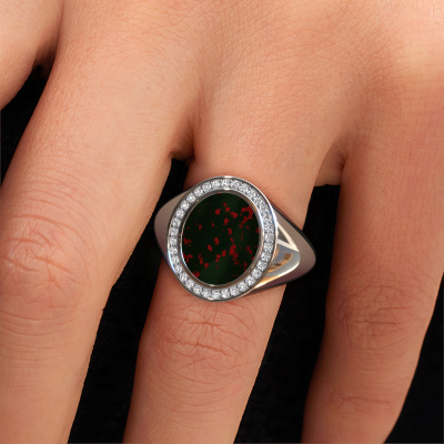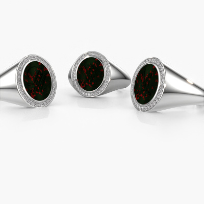 This white gold women´s signet ring is a true work of art! This is our best price Hilda 2 signet ring and it is set with a oval shape bloodstone. In our crafting studio, we use a combination of the latest techniques and ancient traditional craftsmanship, so we are able to create a detailed perfect signet ring. Our expert goldsmiths are fascinated by signet rings. The signet ring can be engraved with initials or a family weapon. Signet rings with family weapons can be handed down from generation to generation and that usually is the case. On top of that, a signet ring is a beautiful, classy piece of jewellery which is trending once more. More than one reason to start or extend the tradition. Please browse our online database for more options on engravings. You can find the departments of our education centre at the bottom of this page. Our goldsmiths passionately create your customized signet ring to your liking with the utmost care. The white gold signet ring, as shown here, can be customized using our online tool. Feel free to ask our jewel designers for assistance if you want changes made which are unavailable in our online tool. We are happy to answer your questions.After receiving your order, our goldsmiths will start the creative process of making your Hilda 2 ring. We don't keep stock. This is advantageous because these costs will not be passed on to you. Therefore, we can offer jewellery at exceptionally low prices.To make it easier for you, we offer a 30 day return policy. Check our terms and conditions.