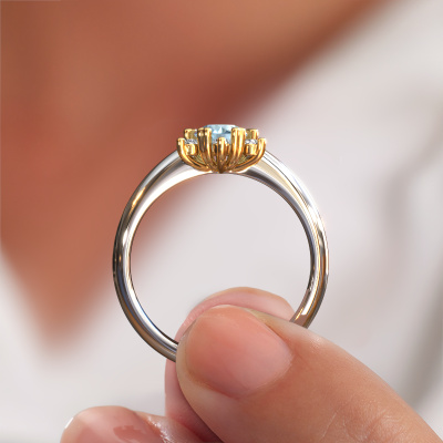 How would you describe your own style? Are you looking for something uniquely different? This cluster white gold Liesbeth ring is astonishing! Simply customize to your or her own liking. This ring is set with blue lab grown diamond. These blue lab grown diamonds have been carefully selected because your ring must be adorned with nothing but the most beautiful gemstone. Wouldn't you agree? Our expert goldsmith will create your ring in our own crafting studios, where the blue lab grown diamond will be set with care. The ring will then be polished to perfection to give it that extra sparkle. It's a perfect ring for a woman of excellent taste!As soon as you finished designing your Liesbeth ring with our online tool, our goldsmiths will start their creative process of making your ring. This will be done with passion and care, according ancient crafting. On top of that, our jewels are made of eco-friendly materials. Simply customize online with our online tool, if you want any changes made. If you want specific changes made to your Liesbeth ring, that are unavailable in our online tool, please feel free to contact our expert designers.By using our modern techniques, we can design and customize the finest quality jewels with the utmost care for you. Our rings are always priced 30 percent lower than other jewellers. We make rings to order, so we don't have to maintain a large stock. If you have a certain budget, we are more than happy to advice you accordingly.To make it easier for you, we offer a 30 day return policy. Check our terms and conditions.