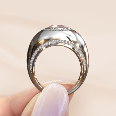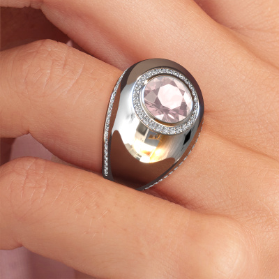 This is a stunning birthstones white gold Roxann ring. It is set with morganite champagne. A designer ring, fit for classy women. The ring is designed by our own expert goldsmiths. In our artisan studio, we use a combination of the latest techniques