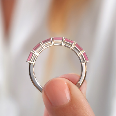 This exclusive white gold Vivienne half EME ring is a true work of art! This ring is made of 14 Carat white gold and is set with 4x2 mm emerald cut tourmaline pink. The smallest ornaments are crafted by our goldsmith with a lot of patience and great passion. In order to create this ring with great precision, this craft requires a keen eye and a skilful hand. A challenge which ignites a fire in our expert goldsmiths. The exquisite tourmaline pink are set in a way that their unique qualities are strengthened. This gives the ring an even more glamorous appearance. The ring is unique by itself though, because of the natural birthstones we selected especially for this Vivienne half EME ring. And by choosing the precious metal yourself, you create a unique ring. As soon as you finished designing your Vivienne half EME ring with our online tool, our goldsmiths will start their creative process of making your ring. This will be done with passion and care, according ancient crafting. On top of that, our jewels are made of eco-friendly materials. Simply customize online with our online tool, if you want any changes made. If you want specific changes made to your Vivienne half EME ring, that are unavailable in our online tool, please feel free to contact our expert designers.After receiving your order, our goldsmiths will passionately start the creative process of making your ring in our own studio. Because we don't have a big stockpile, these costs will not be passed on to you. Our pricing is proof of that! We offer top quality jewels at lowest price, guaranteed.To make it easier for you, we offer a 30 day return policy. Check our terms and conditions.