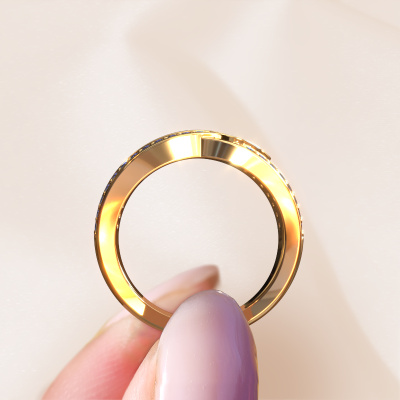 This pave set ring is called Louise. This 14 Carat gold ring is set with sapphire 1.2 mm. The band of this gold ring is set with rows of sapphire which seem to have no beginning nor end. Our goldsmith carefully selects the gemstones and sets them with the utmost precision. For maximum shine, the sapphire have to align perfectly. While artfully crafting and polishing the jewellery, light fall is constantly monitored, until the expert goldsmith is satisfied with the result. Designed by you, created especially for you!How do you like this fantasy gold ring? Simply customize this Louise ring, using our online tool. Subsequently, your personal wide Louise ring will be made by hand by our goldsmiths. Precious metals and gemstones can be customized to your liking. Do you have specific preferences which are unavailable in our online tool? Please feel free to contact us. We will customize your personal fantasy ring to your liking.By using a combination of the latest modern techniques, combined with ancient crafting, we can make all our rings in our own studio. Each jewel is made to order. This is advantageous because we can offer you a price you won't find anywhere else.To make it easier for you, we offer a 30 day return policy. Check our terms and conditions.