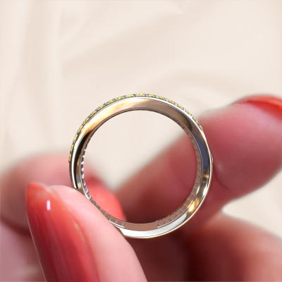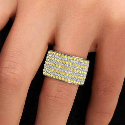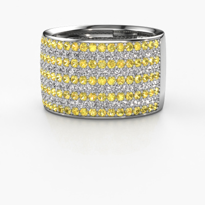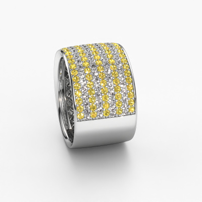 Because of its detailed finish, this wide ring with yellow sapphire has a stylish appearance. A pavé set ring that fits the contemporary woman like a glove. This white gold ring, our Macy, is a true eye-catcher indeed! As soon as we know what you desire, we will create your ring in our own crafting studio. We work according an innovative process. We use a combination of the latest techniques and ancient traditional craftsmanship, so we are able to create a perfectly designed ring. Our expert goldsmiths strive for perfection so they won't stop until a perfect ring, a true work of art, is created especially for you!The best part of this pavé set ring is that you can customize it to your own liking. Your style, your choice, your ring. On top of that, your exclusive white gold ring will be made by hand with eco-friendly materials! Please feel free to easily customize the ring, using our online tool.Are you on a budget? Please feel free to contact us, so we can go discuss your options. We offer our rings at guaranteed best price, because we make them to order. You won't find such a price anywhere else!To make it easier for you, we offer a 30 day return policy. Check our terms and conditions.