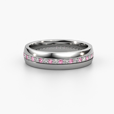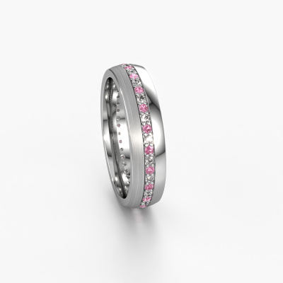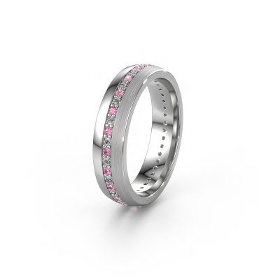 The exclusive Eternity wedding ring is a ring with a beautiful symbolic meaning. Because there appears to be no beginning nor end to the row of pink sapphire. A beautiful way of expressing your everlasting love. A ring to wear until the end of all time, as a symbol of your union. This royal WH0203L25BPM ladies wedding ring has a width of ±0.20 in and is set with pink sapphire 1.3 mm. You can choose the combination of precious metals of your preference in our online tool. Anything goes! It is wise to browse through the characteristics of each different precious metal. For example, gold and silver are softer metals. Carat is determined by the amount of added extra metals. If the goldsmith doesn't add a lot, carat is higher and the wedding ring will be softer. If he adds more metals, the jewel has a lower amount of carat. A softer precious metal can still be used for your exclusive wedding ring! If you prefer a precious metal which will last a lifetime, we recommend platinum. This is the most solid and durable metal our goldsmith uses.Do you have specific wishes regarding your wedding ring, but are you having difficulties finding the design on our website? The be sure to contact our designers! For instance, we can make the band smaller or wider. Do you prefer a matte finish? We can do that! Engravings are a great way of personalizing your rings, and applicable on most designs. Or, if you have an idea of your own for your extraordinary wedding rings, contact us! Our designers are up for the challenge of designing the ring of your dreams!Because we design our wedding rings ourselves, and deliver it directly to you, we can offer you wedding rings at a price you won't find anywhere else. Our rings are made to order, which helps prevent excess supplies, so we can make you a great price offer.To make it easier for you, we offer a 30 day return policy. Check our terms and conditions.