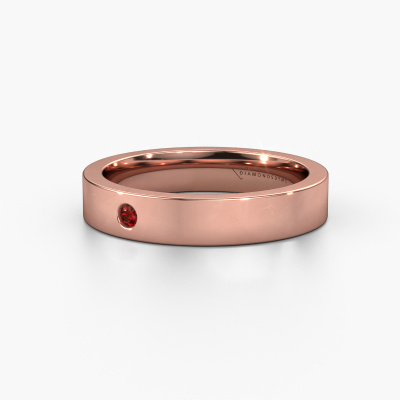 To create your ladies weddings ring in our artisan studio, we use the most modern techniques, combined with ancient craftsmanship. The end result is this modern WH0101L14BP weddings ring, which is crafted to perfection by hand by our goldsmiths. A ring that fills us with pride. This rose gold WH0101L14BP ladies weddings ring with flat profile has an ±0.16 in width and has a shiny finish with garnet. After designing your ring, our jewel designer will start working on it. He will make a graphic 3D design of your weddings ring. This can also be used to make a dummy ring. Simply order a dummy ring and see for yourself how your ring will turn out. Subsequently, our expert goldsmith will create your ring in our own artisan studio. We use eco-friendly gold, so you get a ring, we are proud of, which looks good inside and out. You can also send us your own gold. Because we create your ring by hand, we can use your own gold. Our goal is to create an exquisite sparkling weddings ring just as envisioned it!Do you have special preferences regarding your weddings ring? For instance, a smaller or a wider band? Or perhaps a shiny or a matte ring? There are numerous variations possible. You can always discuss the possibilities with our jewellery designers. If you have certain wedding rings in mind, our designers will gladly help by drawing the rings of your dreams. Be sure to contact us!Because we design our wedding rings ourselves, and deliver it directly to you, we can offer you wedding rings at a price you won't find anywhere else. Our rings are made to order, which helps prevent excess supplies, so we can make you a great price offer.To make it easier for you, we offer a 30 day return policy. Check our terms and conditions.