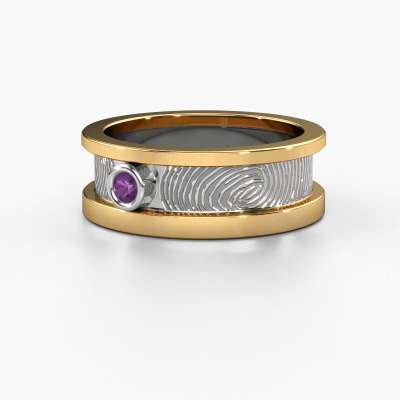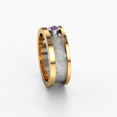What could be more unique than a fingerprint? That makes this ladies wedding ring with amethyst special. A personal fingerprint of your loved one, engraved tot the symbol of your everlasting love. Wouldn't it be lovely to slide this fantasy wedding ring around the finger of your partner on your wedding day? How does it work? First you order the wedding ring after customizing it to your liking. Once your order is placed, you send us an e-mail with the fingerprint you would like to use. For further instructions on how to make a fingerprint, check our database at the bottom of this page. This Francisca wedding ring has an ±0.28 in width. After ordering your wedding ring, our goldsmith will start creating your wedding ring immediately. Did you know we use the latest modern techniques, combined with ancient craftsmanship? This helps to create a 3D design of your jewel. You can order a dummy ring, if you please. This way you can check if the wedding ring meets your standard. Then, our goldsmith, who strives for perfection, will create your ring in our own artisan studio completely by hand. We feel passionate creating a unique ring each time. One which is finished to perfection. In the end, you get a wedding ring which matches your wishes.By the way, you can be inspired by this wedding ring and have it further adjusted to your taste. Do you prefer a smaller band or a wider one? Do you prefer a shiny ring or a matte one? Anything is possible. Also, if you have an idea of your own for extraordinary wedding rings, or if you have seen a beautiful set somewhere else that you really like and would like to have adjusted to your personal taste: no problem! don't hesitate to contact us. Our designers will gladly discuss your possibilities with you!After receiving your order, our goldsmiths will start the creative process of making your wedding rings. We don't keep stock. This is advantageous because these costs will not be passed on to you. Therefore, our quality wedding rings are always priced 30 percent lower than those of other jewellers.To make it easier for you, we offer a 30 day return policy. Check our terms and conditions.