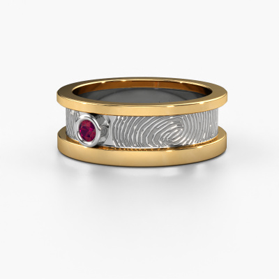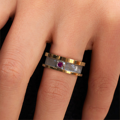 What could be more unique than a fingerprint? That makes this ladies wedding ring with rhodolite special. A personal fingerprint of your loved one, engraved tot the symbol of your everlasting love. Wouldn't it be lovely to slide this fantasy wedding ring around the finger of your partner on your wedding day? How does it work? First you order the wedding ring after customizing it to your liking. Once your order is placed, you send us an e-mail with the fingerprint you would like to use. For further instructions on how to make a fingerprint, check our database at the bottom of this page. This Francisca wedding ring has an ±0.28 in width. After ordering your wedding ring, our goldsmith will start creating your wedding ring immediately. Did you know we use the latest modern techniques, combined with ancient craftsmanship? This helps to create a 3D design of your jewel. You can order a dummy ring, if you please. This way you can check if the wedding ring meets your standard. Then, our goldsmith, who strives for perfection, will create your ring in our own artisan studio completely by hand. We feel passionate creating a unique ring each time. One which is finished to perfection. In the end, you get a wedding ring which matches your wishes.By the way, you can be inspired by this wedding ring and have it further adjusted to your taste. Do you prefer a smaller band or a wider one? Do you prefer a shiny ring or a matte one? Anything is possible. Also, if you have an idea of your own for extraordinary wedding rings, or if you have seen a beautiful set somewhere else that you really like and would like to have adjusted to your personal taste: no problem! don't hesitate to contact us. Our designers will gladly discuss your possibilities with you!After receiving your order, our goldsmiths will start the creative process of making your wedding rings. We don't keep stock. This is advantageous because these costs will not be passed on to you. Therefore, our quality wedding rings are always priced 30 percent lower than those of other jewellers.To make it easier for you, we offer a 30 day return policy. Check our terms and conditions.