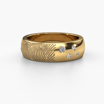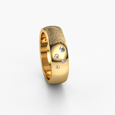 What could be more unique than a fingerprint? That makes this unisex wedding ring with diamond special. A personal fingerprint of your loved one, engraved tot the symbol of your everlasting love. Wouldn't it be lovely to slide this modern wedding ring around the finger of your partner on your wedding day? How does it work? First you order the wedding ring after customizing it to your liking. Once your order is placed, you send us an e-mail with the fingerprint you would like to use. For further instructions on how to make a fingerprint, check our database at the bottom of this page. This Minke wedding ring has an ±0.24 in width. After ordering your wedding ring, our goldsmith will start creating your wedding ring immediately. Did you know we use the latest modern techniques, combined with ancient craftsmanship? This helps to create a 3D design of your jewel. You can order a dummy ring, if you please. This way you can check if the wedding ring meets your standard. Then, our goldsmith, who strives for perfection, will create your ring in our own artisan studio completely by hand. We feel passionate creating a unique ring each time. One which is finished to perfection. In the end, you get a wedding ring which matches your wishes.By the way, you can be inspired by this wedding ring and have it further adjusted to your taste. Do you prefer a smaller band or a wider one? Do you prefer a shiny ring or a matte one? Anything is possible. Also, if you have an idea of your own for extraordinary wedding rings, or if you have seen a beautiful set somewhere else that you really like and would like to have adjusted to your personal taste: no problem! don't hesitate to contact us. Our designers will gladly discuss your possibilities with you!Because we design and deliver our own wedding rings, we can offer you wedding rings at a price you won't find anywhere else. A ring is made to order, which helps prevent excess supplies, so we can make you a great price offer.To make it easier for you, we offer a 30 day return policy. Check our terms and conditions.