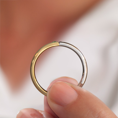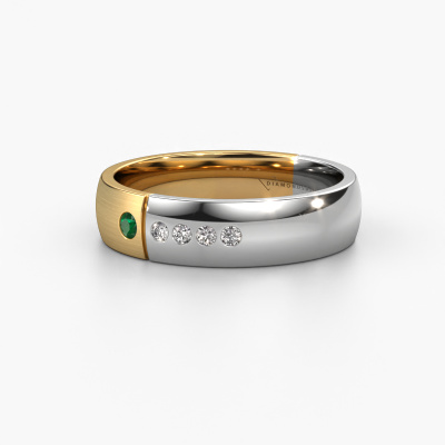 What a perfect combination of two different precious metals. They seem to reinforce each other in the modern design of this ring! Our goldsmith would be honoured to create a unique ring for you, customized to your liking. Each ladies wedding ring we offer is artfully crafted by hand in our own artisan studio. That makes it possible for us to turn modern into reality and helps create your own personal ring, customized to your style. This modern WH1101L25SAMP ladies wedding ring is set with round emerald, is ±0.20 in wide and has a mat/shiny finish.