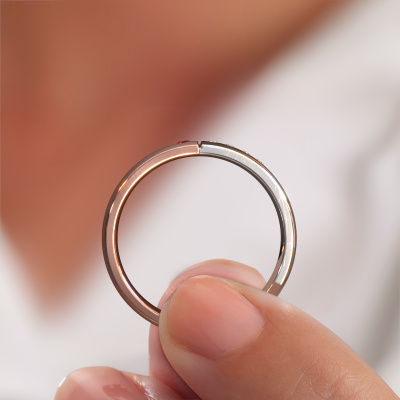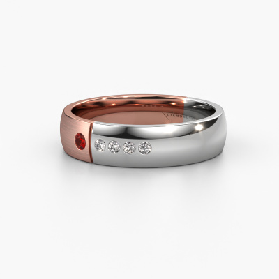What a perfect combination of two different precious metals. They seem to reinforce each other in the modern design of this ring! Our goldsmith would be honoured to create a unique ring for you, customized to your liking. Each ladies wedding ring we offer is artfully crafted by hand in our own artisan studio. That makes it possible for us to turn modern into reality and helps create your own personal ring, customized to your style. This modern WH1101L25SAMP ladies wedding ring is set with round garnet, is ±0.20 in wide and has a mat/shiny finish.