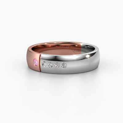 What a perfect combination of two different precious metals. They seem to reinforce each other in the modern design of this ring! Our goldsmith would be honoured to create a unique ring for you, customized to your liking. Each ladies wedding ring we offer is artfully crafted by hand in our own artisan studio. That makes it possible for us to turn modern into reality and helps create your own personal ring, customized to your style. This modern WH1101L25SAMP ladies wedding ring is set with round pink sapphire, is ±0.20 in wide and has a mat/shiny finish.