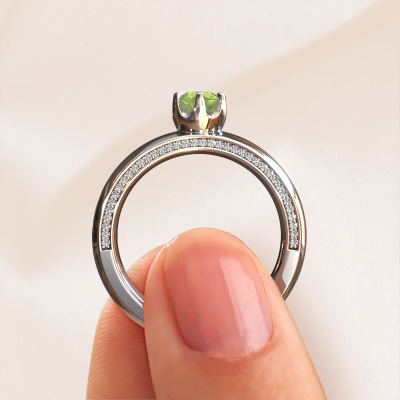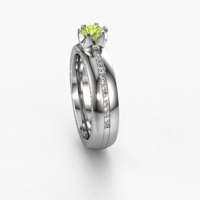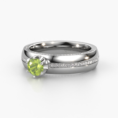 If you are looking for an exclusive, unique weddings ring with an exquisite look, this ring is perfect for you. Because it can be customized to your style, this weddings ring can be turned into a unique, exclusive piece of jewellery. This unique ladies weddings ring is a perfect combination of ancient craftsmanship, love, passion and the latest modern techniques. This unique WH0416L25E weddings ring is set with peridot 5 mm, is ±0.20 in wide and has a shiny finish. After designing your ring, our jewel designer will start working on it. He will make a graphic 3D design of your weddings ring. This can also be used to make a dummy ring. Simply order a dummy ring and see for yourself how your ring will turn out. Subsequently, our expert goldsmith will create your ring in our own artisan studio. We use eco-friendly gold, so you get a ring, we are proud of, which looks good inside and out. You can also send us your own gold. Because we create your ring by hand, we can use your own gold. Our goal is to create an exquisite sparkling weddings ring just as envisioned it!By the way, you can be inspired by this weddings ring and have it further adjusted to your taste. Do you prefer a smaller band or a wider one? Do you prefer a shiny ring or a matte one? Anything is possible. Also, if you have an idea of your own for extraordinary wedding rings, or if you have seen a beautiful set somewhere else that you really like and would like to have adjusted to your personal taste: no problem! don't hesitate to contact us. Our designers will gladly discuss your possibilities with you!After receiving your order, our goldsmiths will start the creative process of making your wedding rings. We don't keep stock. This is advantageous because these costs will not be passed on to you. Therefore, our quality wedding rings are always priced 30 percent lower than those of other jewellers.To make it easier for you, we offer a 30 day return policy. Check our terms and conditions.