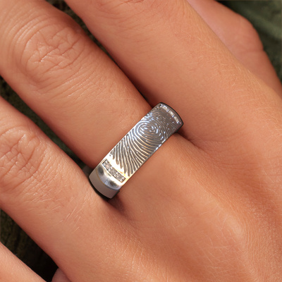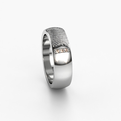 What could be more unique than a fingerprint? That makes this ladies wedding ring with brown diamond special. A personal fingerprint of your loved one, engraved tot the symbol of your everlasting love. Wouldn't it be lovely to slide this fantasy wedding ring around the finger of your partner on your wedding day? How does it work? First you order the wedding ring after customizing it to your liking. Once your order is placed, you send us an e-mail with the fingerprint you would like to use. For further instructions on how to make a fingerprint, check our database at the bottom of this page. This Daine wedding ring has an ±0.24 in width. Gold represents love and therefore our goldsmith loves using it in the design of your fantasy wedding ring. We are a proud member of the Responsible Jewellery Council. This means we only use eco-friendly gold. Something we take great pride in, obviously. It is also possible to use your own gold in the design of your wedding ring. Each jewel is made by hand in our own artisan studio so we can offer this option. This gives you the opportunity to add an extra personal touch to your ring. A ring with its own history!By the way, you can be inspired by this wedding ring and have it further adjusted to your taste. Do you prefer a smaller band or a wider one? Do you prefer a shiny ring or a matte one? Anything is possible. Also, if you have an idea of your own for extraordinary wedding rings, or if you have seen a beautiful set somewhere else that you really like and would like to have adjusted to your personal taste: no problem! don't hesitate to contact us. Our designers will gladly discuss your possibilities with you!Because we design and deliver our own wedding rings, we can offer you wedding rings at a price you won't find anywhere else. A ring is made to order, which helps prevent excess supplies, so we can make you a great price offer.To make it easier for you, we offer a 30 day return policy. Check our terms and conditions.