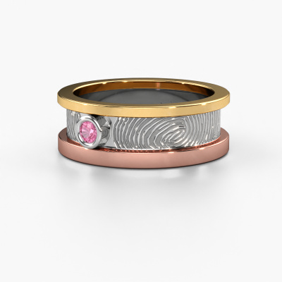 What could be more unique than a fingerprint? That makes this ladies wedding ring with pink sapphire special. A personal fingerprint of your loved one, engraved tot the symbol of your everlasting love. Wouldn't it be lovely to slide this fantasy wedding ring around the finger of your partner on your wedding day? How does it work? First you order the wedding ring after customizing it to your liking. Once your order is placed, you send us an e-mail with the fingerprint you would like to use. For further instructions on how to make a fingerprint, check our database at the bottom of this page. This Francisca wedding ring has an ±0.28 in width. After ordering your wedding ring, our goldsmith will start creating your wedding ring immediately. Did you know we use the latest modern techniques, combined with ancient craftsmanship? This helps to create a 3D design of your jewel. You can order a dummy ring, if you please. This way you can check if the wedding ring meets your standard. Then, our goldsmith, who strives for perfection, will create your ring in our own artisan studio completely by hand. We feel passionate creating a unique ring each time. One which is finished to perfection. In the end, you get a wedding ring which matches your wishes.By the way, you can be inspired by this wedding ring and have it further adjusted to your taste. Do you prefer a smaller band or a wider one? Do you prefer a shiny ring or a matte one? Anything is possible. Also, if you have an idea of your own for extraordinary wedding rings, or if you have seen a beautiful set somewhere else that you really like and would like to have adjusted to your personal taste: no problem! don't hesitate to contact us. Our designers will gladly discuss your possibilities with you!After receiving your order, our goldsmiths will start the creative process of making your wedding rings. We don't keep stock. This is advantageous because these costs will not be passed on to you. Therefore, our quality wedding rings are always priced 30 percent lower than those of other jewellers.To make it easier for you, we offer a 30 day return policy. Check our terms and conditions.