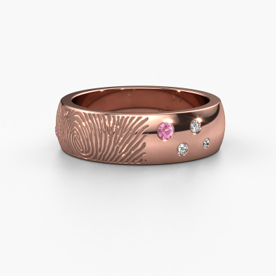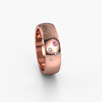 What could be more unique than a fingerprint? That makes this unisex wedding ring with pink sapphire special. A personal fingerprint of your loved one, engraved tot the symbol of your everlasting love. Wouldn't it be lovely to slide this modern wedding ring around the finger of your partner on your wedding day? How does it work? First you order the wedding ring after customizing it to your liking. Once your order is placed, you send us an e-mail with the fingerprint you would like to use. For further instructions on how to make a fingerprint, check our database at the bottom of this page. This Minke wedding ring has an ±0.24 in width. After ordering your wedding ring, our goldsmith will start creating your wedding ring immediately. Did you know we use the latest modern techniques, combined with ancient craftsmanship? This helps to create a 3D design of your jewel. You can order a dummy ring, if you please. This way you can check if the wedding ring meets your standard. Then, our goldsmith, who strives for perfection, will create your ring in our own artisan studio completely by hand. We feel passionate creating a unique ring each time. One which is finished to perfection. In the end, you get a wedding ring which matches your wishes.By the way, you can be inspired by this wedding ring and have it further adjusted to your taste. Do you prefer a smaller band or a wider one? Do you prefer a shiny ring or a matte one? Anything is possible. Also, if you have an idea of your own for extraordinary wedding rings, or if you have seen a beautiful set somewhere else that you really like and would like to have adjusted to your personal taste: no problem! don't hesitate to contact us. Our designers will gladly discuss your possibilities with you!Because we design and deliver our own wedding rings, we can offer you wedding rings at a price you won't find anywhere else. A ring is made to order, which helps prevent excess supplies, so we can make you a great price offer.To make it easier for you, we offer a 30 day return policy. Check our terms and conditions.