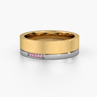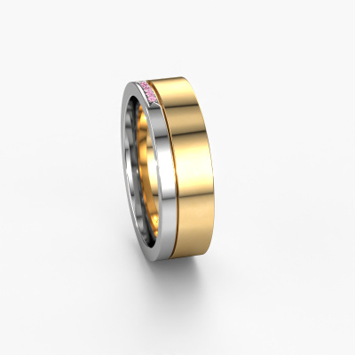 What a perfect combination of two different precious metals. They seem to reinforce each other in the modern design of this ring! Our goldsmith would be honoured to create a unique ring for you, customized to your liking. Each ladies weddings ring we offer is artfully crafted by hand in our own artisan studio. That makes it possible for us to turn modern into reality and helps create your own personal ring, customized to your style. This modern WH0336L16A ladies weddings ring is set with round pink sapphire, is ±0.24 in wide and has a shiny finish. Gold represents love and therefore our goldsmith loves using it in the design of your modern weddings ring. We are a proud member of the Responsible Jewellery Council. This means we only use eco-friendly gold. Something we take great pride in, obviously. It is also possible to use your own gold in the design of your weddings ring. Each jewel is made by hand in our own artisan studio so we can offer this option. This gives you the opportunity to add an extra personal touch to your ring. A ring with its own history!By the way, you can be inspired by this weddings ring and have it further adjusted to your taste. Do you prefer a smaller band or a wider one? Do you prefer a shiny ring or a matte one? Anything is possible. Also, if you have an idea of your own for extraordinary wedding rings, or if you have seen a beautiful set somewhere else that you really like and would like to have adjusted to your personal taste: no problem! don't hesitate to contact us. Our designers will gladly discuss your possibilities with you!After receiving your order, our goldsmiths will passionately start the creative process of making your wedding rings in our own artisan studio. Because we do not maintain a large stockpile, we can offer our jewellery at a lower price than other jewellers. Our pricing is proof of that! We offer top quality jewels at lowest price, guaranteed.To make it easier for you, we offer a 30 day return policy. Check our terms and conditions.