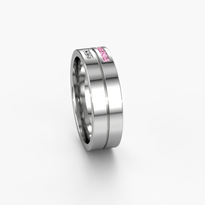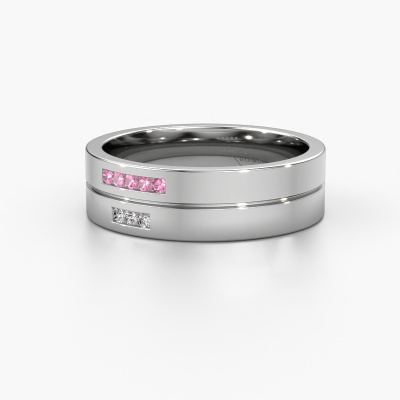 What a perfect combination of two different precious metals. They seem to reinforce each other in the modern design of this ring! Our goldsmith would be honoured to create a unique ring for you, customized to your liking. Each ladies wedding ring we offer is artfully crafted by hand in our own artisan studio. That makes it possible for us to turn modern into reality and helps create your own personal ring, customized to your style. This modern WH0207L16AP ladies wedding ring is set with round pink sapphire, is ±0.24 in wide and has a shiny finish.