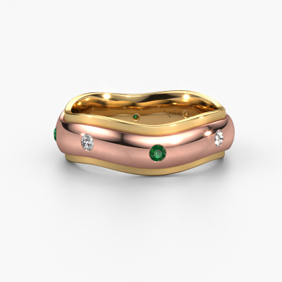 What a perfect combination of two different precious metals. They seem to reinforce each other in the modern design of this ring! Our goldsmith would be honoured to create a unique ring for you, customized to your liking. Each ladies wedding ring we offer is artfully crafted by hand in our own artisan studio. That makes it possible for us to turn modern into reality and helps create your own personal ring, customized to your style. This modern WH2051L26DP ladies wedding ring is set with round emerald, is ±0.24 in wide and has a mat/shiny finish.