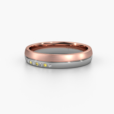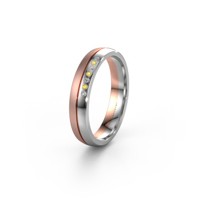 What a perfect combination of two different precious metals. They seem to reinforce each other in the trendy design of this ring! Our goldsmith would be honoured to create a unique ring for you, customized to your liking. Each ladies wedding ring we offer is artfully crafted by hand in our own artisan studio. That makes it possible for us to turn trendy into reality and helps create your own personal ring, customized to your style. This trendy WH0216L24APM ladies wedding ring is set with round yellow sapphire, is ±0.16 in wide and has a mat/shiny finish. You can choose the combination of precious metals of your preference in our online tool. Anything goes! It is wise to browse through the characteristics of each different precious metal. For example, gold and silver are softer metals. Carat is determined by the amount of added extra metals. If the goldsmith doesn't add a lot, carat is higher and the wedding ring will be softer. If he adds more metals, the jewel has a lower amount of carat. A softer precious metal can still be used for your trendy wedding ring! If you prefer a precious metal which will last a lifetime, we recommend platinum. This is the most solid and durable metal our goldsmith uses.By the way, you can be inspired by this wedding ring and have it further adjusted to your taste. Do you prefer a smaller band or a wider one? Do you prefer a shiny ring or a matte one? Anything is possible. Also, if you have an idea of your own for extraordinary wedding rings, or if you have seen a beautiful set somewhere else that you really like and would like to have adjusted to your personal taste: no problem! don't hesitate to contact us. Our designers will gladly discuss your possibilities with you!After receiving your order, our goldsmiths will start the creative process of making your wedding rings. We don't keep stock. This is advantageous because these costs will not be passed on to you. Therefore, our quality wedding rings are always priced 30 percent lower than those of other jewellers.To make it easier for you, we offer a 30 day return policy. Check our terms and conditions.