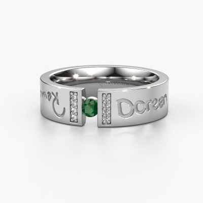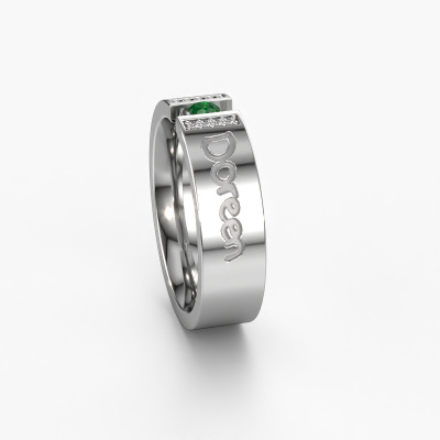 A unique wedding ring with emerald! What makes this ladies wedding ring WH2094L16C special, is that you can have it engraved with a special text, which has meaning to you. A word, a short phrase or part of the lyrics to a song. Whichever text is most meaningful to you. Memorialize it as an exquisite engravement on this modern wedding ring. This own Text ladies wedding ring has an ±0.24 in width. You can choose the combination of precious metals of your preference in our online tool. Anything goes! It is wise to browse through the characteristics of each different precious metal. For example, gold and silver are softer metals. Carat is determined by the amount of added extra metals. If the goldsmith doesn't add a lot, carat is higher and the wedding ring will be softer. If he adds more metals, the jewel has a lower amount of carat. A softer precious metal can still be used for your modern wedding ring! If you prefer a precious metal which will last a lifetime, we recommend platinum. This is the most solid and durable metal our goldsmith uses.This wedding ring can also serve as a source of inspiration. Would you like the ring to have a matte or shiny finish (at no additional cost), or would you prefer it to be wider or narrower? Anything is possible. Because there are countless variations, we can’t show everything on our website. Do you have an idea for beautiful wedding rings, or have you seen a stunning set of wedding rings elsewhere? Feel free to contact us; our designers are ready to assist you.By combining our modern techniques with ancient crafting, we can design and customize the finest quality jewels with the utmost care for you at the best price. Our wedding rings are always priced 30% lower than those of other jewellers. We make wedding rings to order so we don't have to maintain a large stock.To make it easier for you, we offer a 30 day return policy. Check our terms and conditions.