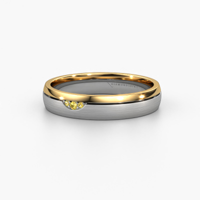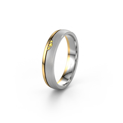 A unique two-tone white gold ladies wedding ring, designed by you, and then artfully crafted by our goldsmith in our own artisan studio! A beautiful symbol, reflecting your love, which you carry with you for a lifetime! Each ring we offer is artfully forged by hand in our own crafting studio. This makes it possible for us to create you a ring which is customized to your liking, completely mat/shiny your style. This contemporary WH0334L24X wedding ring is set with yellow sapphire, is ±0.16 in wide and has a mat/shiny finish. Choosing a wedding ring is not done on a whim. In the end, you want a ring that completely matches your style and preferences. A reflection of your love and relationship. A ring to last a lifetime. A symbol of all that unites you. Creating your dream ring is what gets us excited. This is artfully done by hand in our own crafting studio, so we can create your ring to perfection. The most rewarding job in the world!Do you have specific wishes regarding your wedding ring, but are you having difficulties finding the design on our website? The be sure to contact our designers! For instance, we can make the band smaller or wider. Do you prefer a matte finish? We can do that! Engravings are a great way of personalizing your rings, and applicable on most designs. Or, if you have an idea of your own for your extraordinary wedding rings, contact us! Our designers are up for the challenge of designing the ring of your dreams!Because we design our wedding rings ourselves, and deliver it directly to you, we can offer you wedding rings at a price you won't find anywhere else. Our rings are made to order, which helps prevent excess supplies, so we can make you a great price offer.To make it easier for you, we offer a 30 day return policy. Check our terms and conditions.